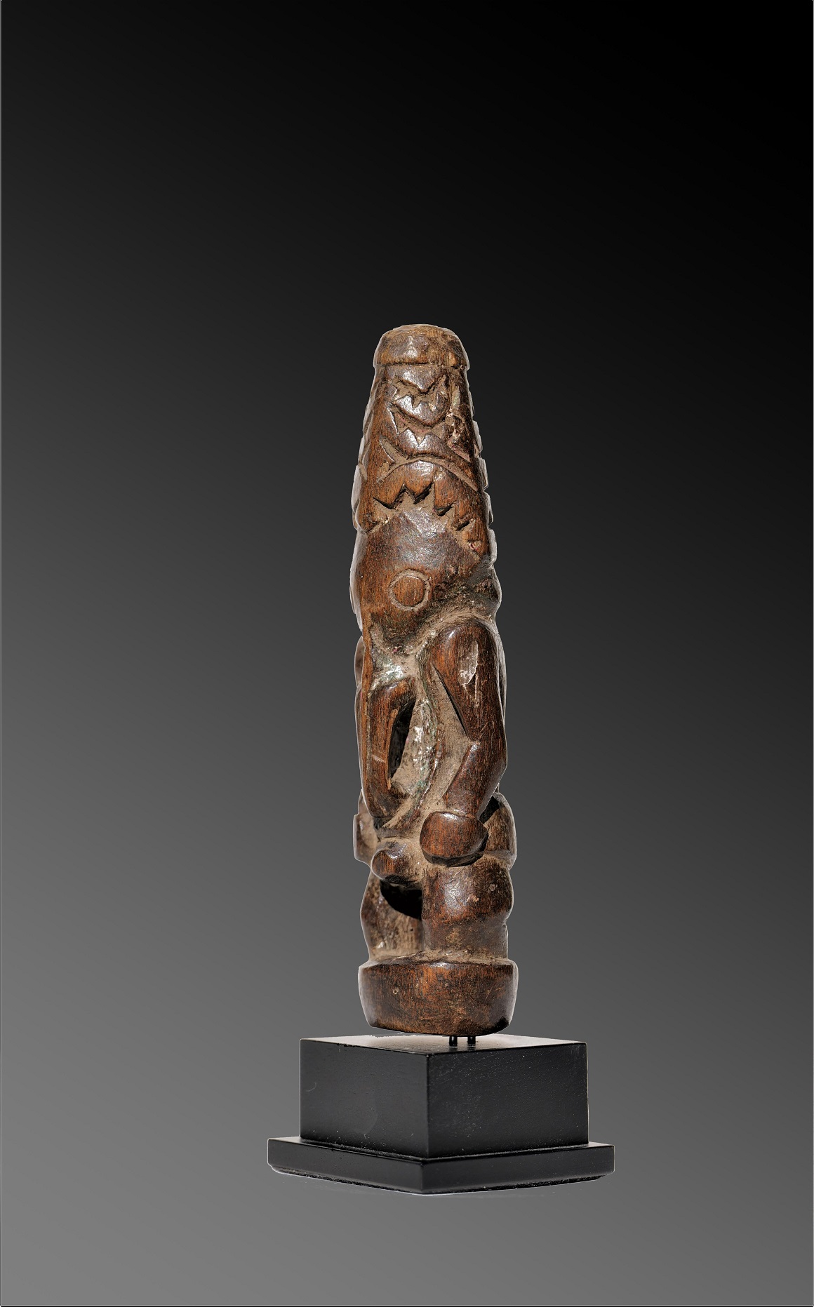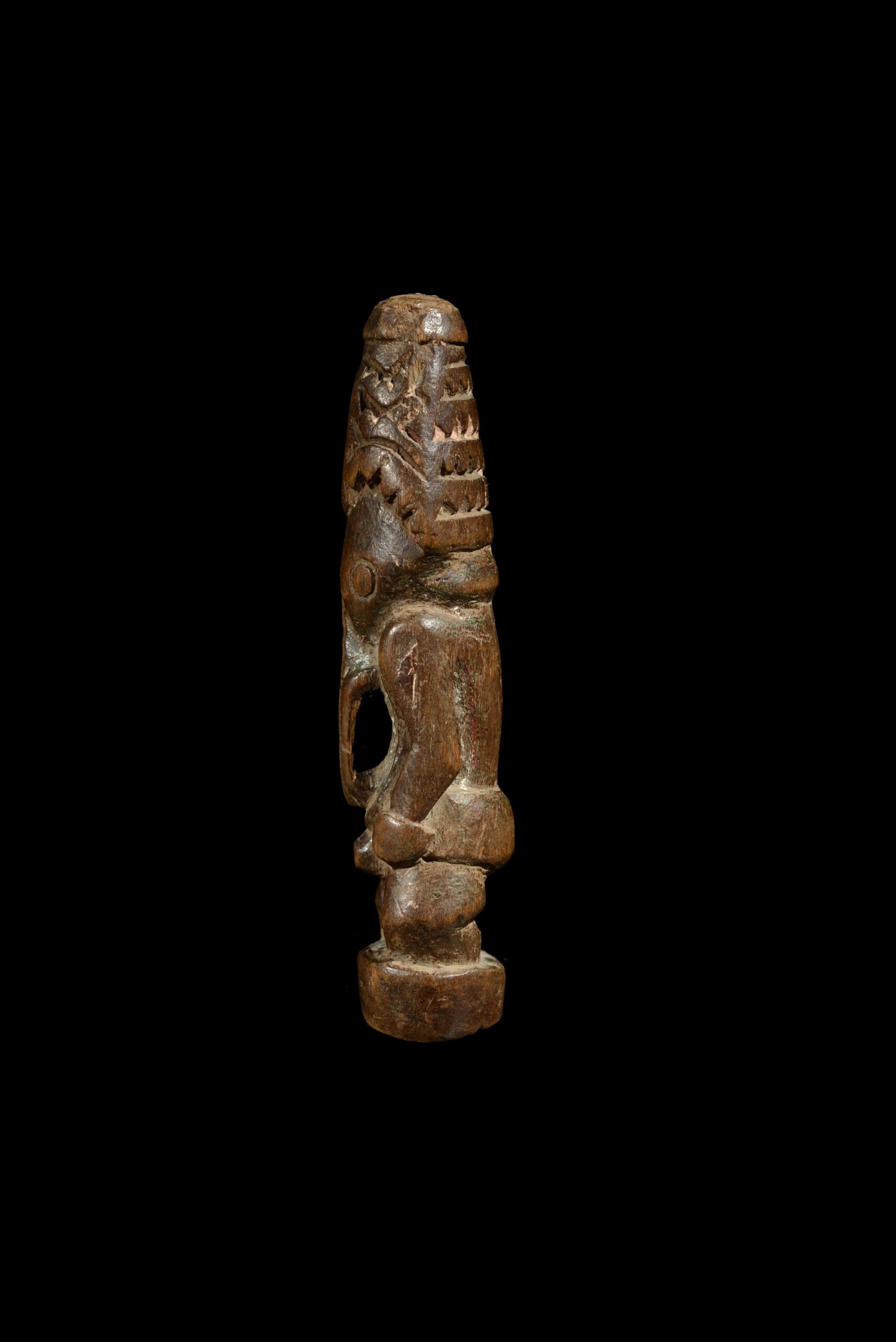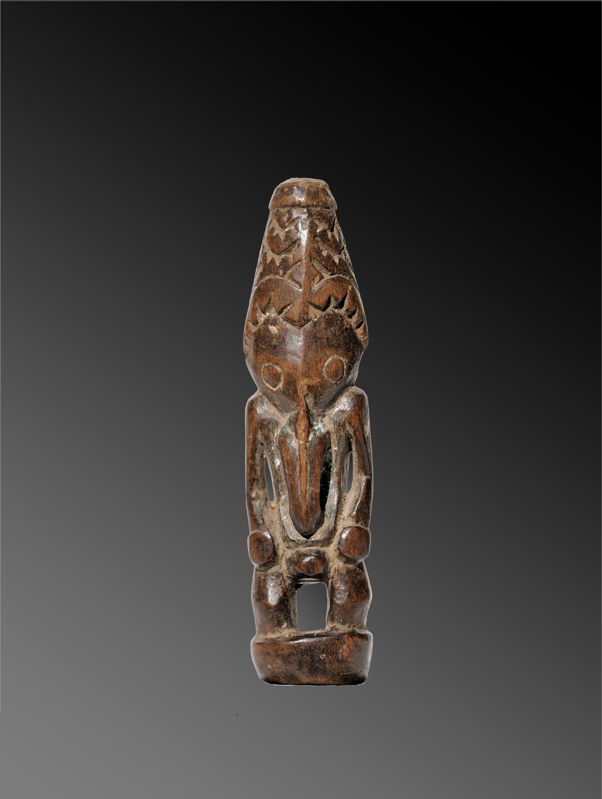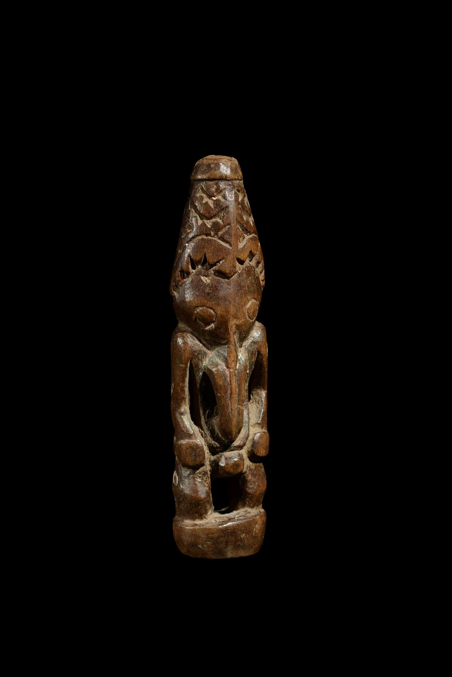 The head is topped with a headdress. As in most Lower Sepik sculptures, the long nose probably indicates that the figure embodies a mythological spirit, rather than a true ancestor, whose smaller formats, as seen here, were worn as personal amulets intended to promote the protection of ancestral spirits in various areas of daily life. The anthropo-zoomorphic figure stands in the conventional posture, upright on short legs – feet merging into a circular base, arms free from the body, hands resting on the hips. The face, dominated by two large round eyes, is prolonged by a long nasal appendage curving down to the lower abdomen, evoking a bird’s beak, an element that would seem to indicate the spiritual nature of the entity represented. The head is topped by a high conical crest engraved with deep motifs. The surface has a glossy brown patina, with the contours in places enhanced by a white coating, testifying to the use of this protective charm, guaranteeing the intimate link between the individual and the clan spirit.