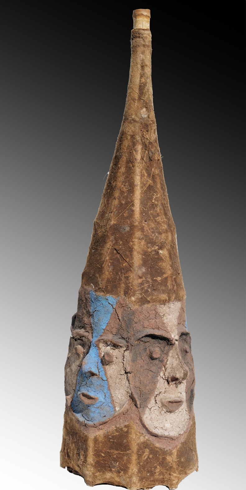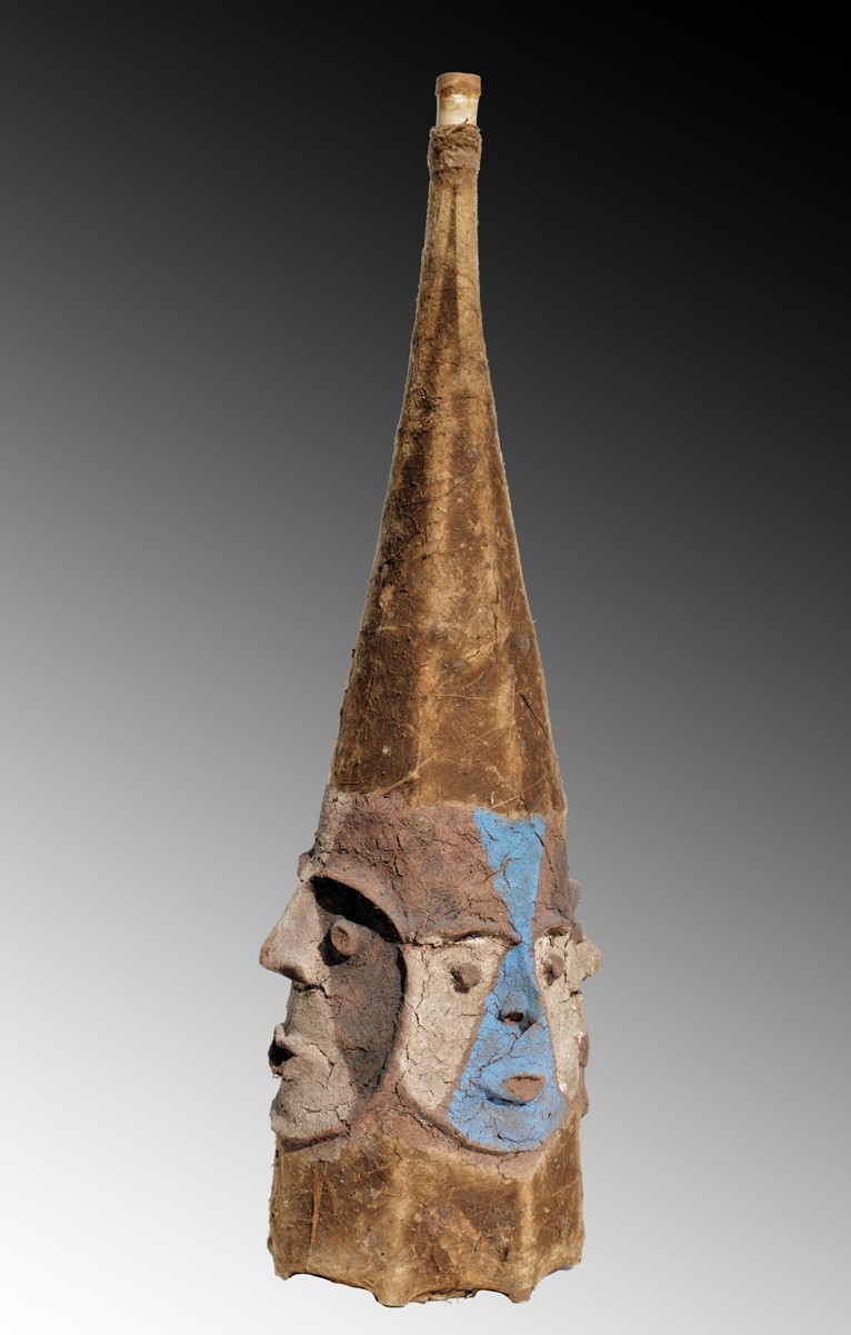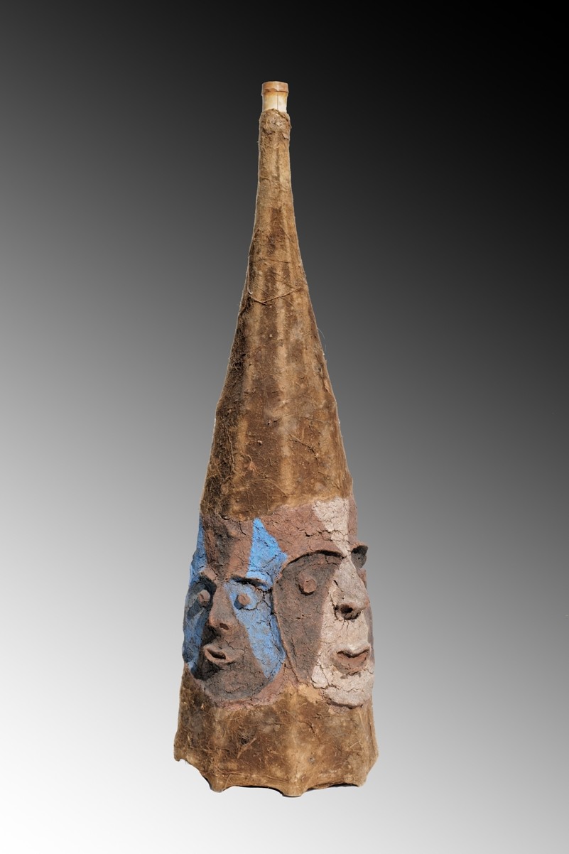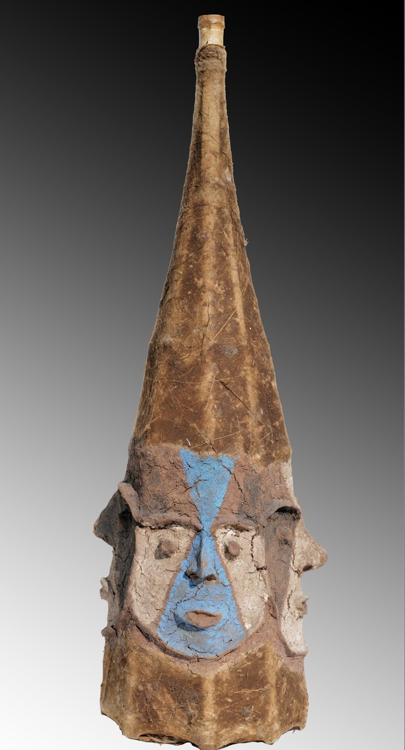 Ce type de masque, porté sur la tête, était tenu par le danseur à l’aide de deux ficelles. Il est constitué d’une armature en bambous fendus, ligaturés, puis recouverte de toiles d’araignées. Quatre visages sont modelés à partir d’un revêtement composé de bouillie de lianes mélangées à du lait de coco et à de l’eau de mer.